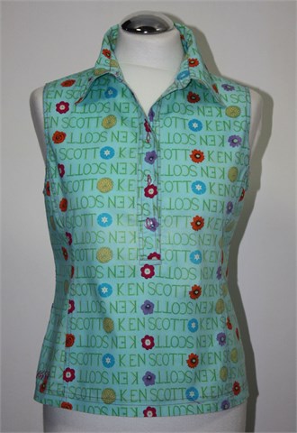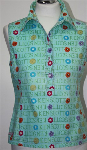 Ken Scott bluza bez rukava, plave boje sa printom (boje i uzorci kao na slikama - mjestimično ima blago isprani izgled - vidljivo na slikama). Prednje kopčanje sa prozirnim gumbima (do cca pola dužine), prednji i stražnji ušitci (blago strukirana). Malo rastezljiva.