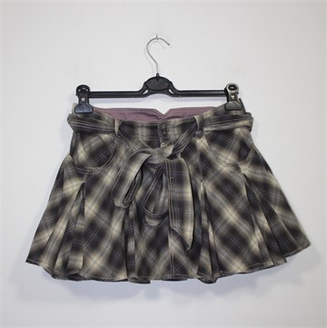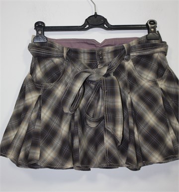 Kenvelo kratka suknja sa kariranim uzorkom (boje kao na slici). Prednje kopčanje, pasica za remen sa pripadajućim remenom od istog materijala. Prednji džepovi, faldasti ušitci sa obje strane. Lagana i tanja.
