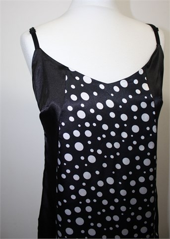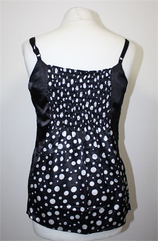 Keyra topić sa tankim prilagodljivim naramenicama, crne boje sa bijelim točkicama. Prednji i stražnji ušitci (strukiran), rastezljive gumice na leđima. Mali bočni prorezi. Lagan, gladak i svilenkast materijal.