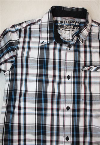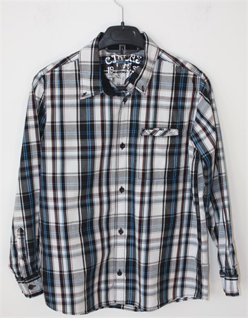 Kids by Lindex košulja sa dugim rukavima, bijele boje sa prugastim uzorkom (boje uzorka vidljive na slikama). Prednje kopčanje, džepić na prsima i kraju svakog rukava. Nije rastezljiva.