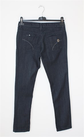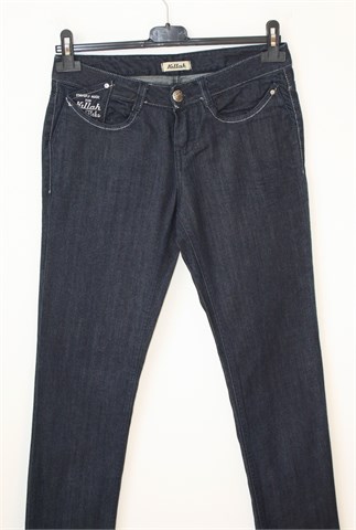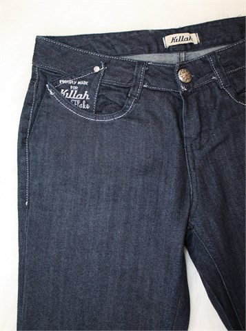Killah traper hlače, tamno plave boje. Prednji cif i kopčanje, pasica za remen. Prednji i stražnji džepovi, blago rastezljive. Mjestimično prošivene (i ukrašene) srebrnim koncem (Killah metalna pločica na stražnjem džepu).