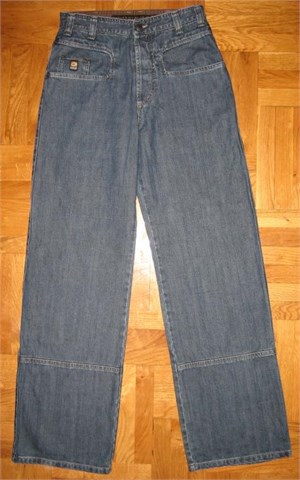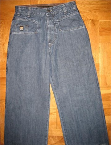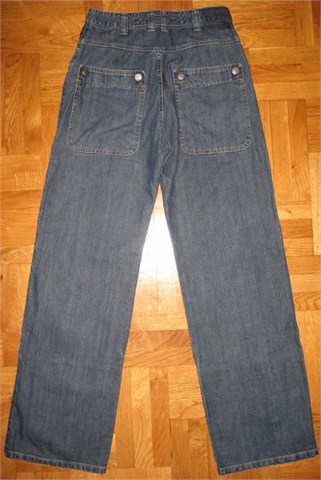 Traper hlače visokog struka. Široke nogavice. Prednji i stražnji duboki džepovi. Na hlačama piše veličina 42 ali su manje (uzak struk) pa više odgovaraju veličini 40. Nisu rastezljive.