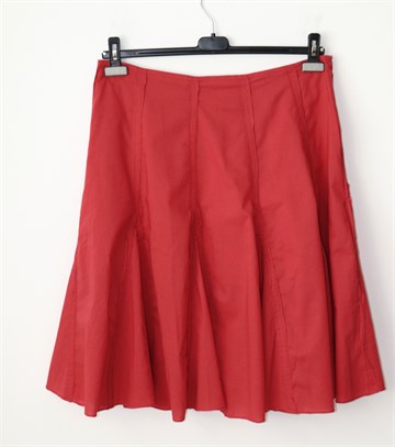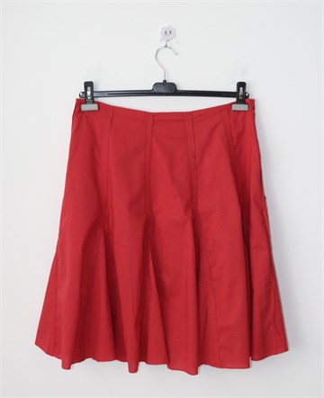 Kiska & Kiska suknja ugodne crvene boje (tamnija/zagasitija crvena boja uživo). Preštepane falde sa prednje i stražnje strane, bočni cif. Podstavljena pamučnom podstavom. Lagana i prozračna.