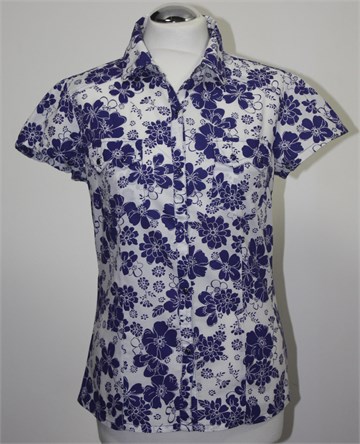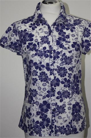 Košulja sa kratkim rukavima, bijele boje sa plavim cvjetnim printom. Prednje kopčanje na drukere, dva džepića na prsima sa drukerima (svi drukeri su plave boje). Prednji i stražnji ušitci, strukirana. Gumica oko rukava. Čvrst i nerastezljiv materijal.