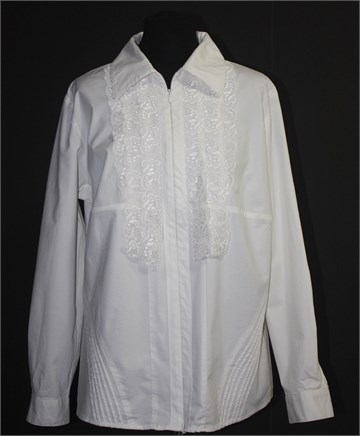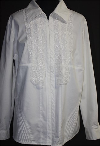 Košulja sa dugim rukavima prljavo bijele boje, sa prednje strane našivene trakice od čipke. Kopčanje sa cifom (dvosmjernim), bočni ukrasni prošivi. Nema ušitaka (nije strukirana), čvrst i blago rastezljiv materijal.