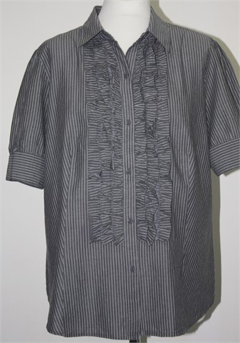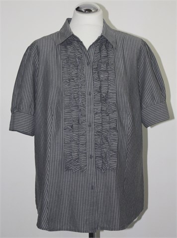 Košulja sa kratkim rukavima, sive boje sa bijelim prugama. Prednji ukrasni volančići, strukirana. Lagana i prozračna.