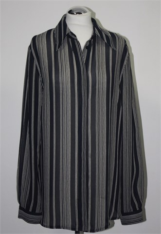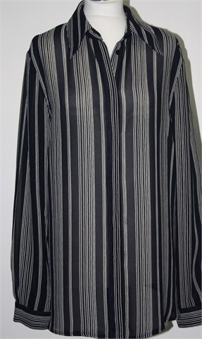 Košulja sa dugim rukavima, tamno plave boje sa bijelim prugama koje po sebi imaju sitni točkasti blijedožuti uzorak (jedva primjetan). Prednje skriveno kopčanje, prednji ušitci. Tanja i prozračna, providna.