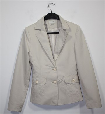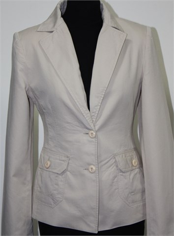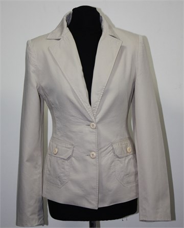 Koton jakna/sako od pamuka, svijetlo bež boje. Prednje kopčanje, bočni džepovi sa preklopom i gumbom. Jastučići u ramenima, podstavljena.