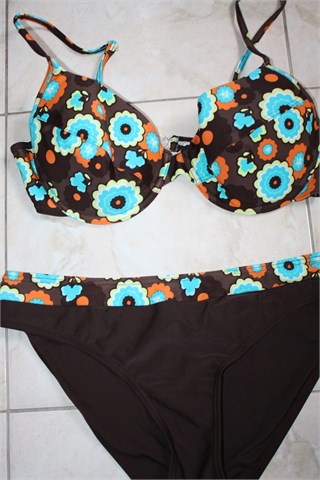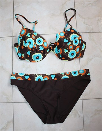 Dvodjelni kupaći kostim/bikini tamno smeđe boje sa cvjetnim printom (boje i uzorci kao na slici). Podesive naramenice, spužvasto podstavljene košarice.