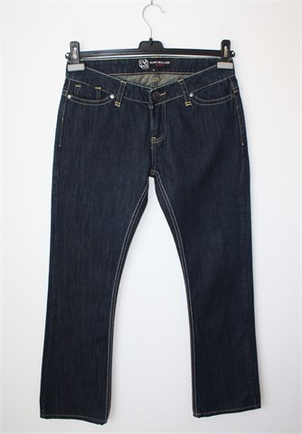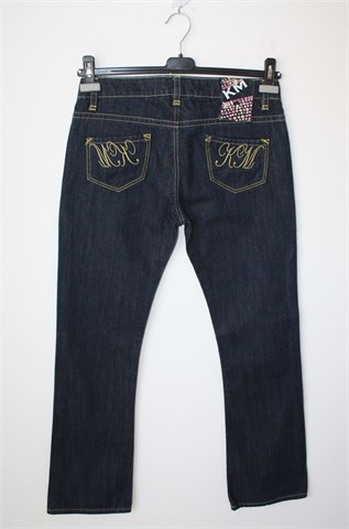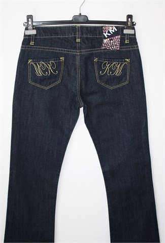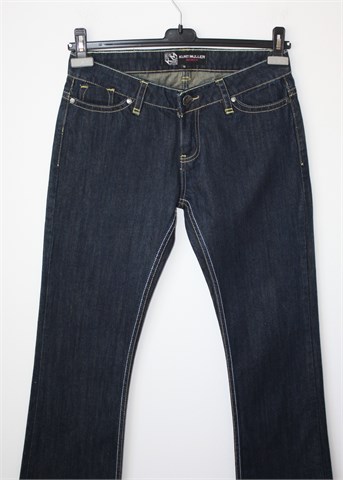 Kurt Muller Woman traper hlače tamno plave boje. Prednji cif i kopčanje, pasica za remen. Prednji i stražnji džepovi (stražnji ukrašeni aplikacijama od zlatnog konca), ukrasi na pasici. Nisu rastezljive.