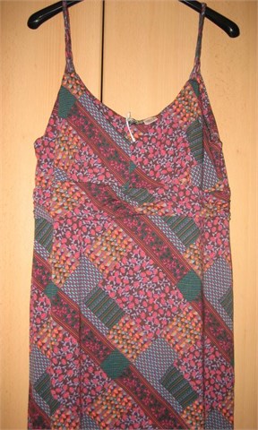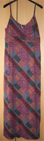 Prekrasna dugačka haljina sa uzorkom u toplim, zemljanim bojama. Rezana ispod grudi, prema dolje blagi pad. Tanke pletene naramenice, fiksne. Gornji dio podstavljen i naboran ušitcima. Vrlo mekan i rastezljiv materijal.