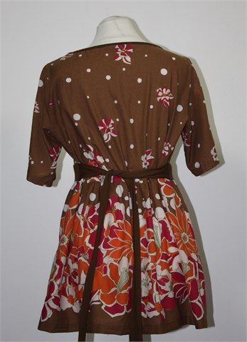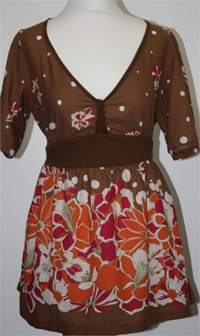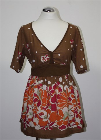 La Redoute (linija taillissime) bluza sa kratkim rukavima, smeđe boje sa cvjetnim i točkastim printom (boje i uzorak kao na slikama). Bočne trakice za vezanje (vežu se sa stražnje strane), tanji i lagan pamuk.