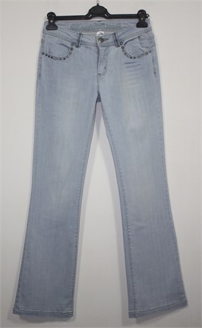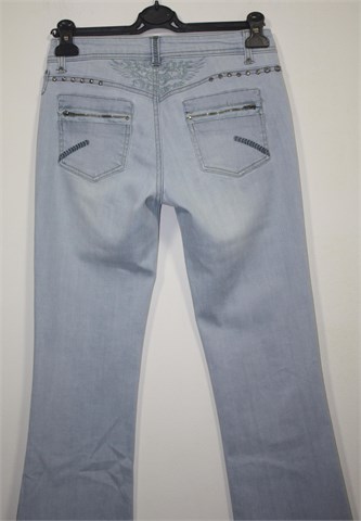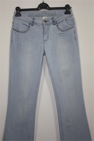 La Redoute traper hlače, svijetlo plave boje blago ispranog izgleda (used look). Prednji cif i kopčanje, pasica za remen. Prednji klasični džepovi (ukrašeni zakovicama i cirkonima), stražnji džepovi sa cifovima. Sa stražnje strane, ispod pasice, je aplikacija. Rastezljiv traper, lijepo se prilagođavaju tijelu.