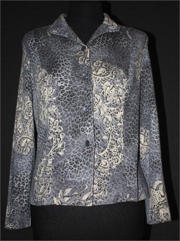 Vestica na kopčanje sa prošaranim uzorkom, dugi rukavi (krojena kao košulja). Mekan, mucast i rastezljiv materijal (nema etiketu sa sastavom). Prednji i stražnji ušitci, ukrasni gumbi.