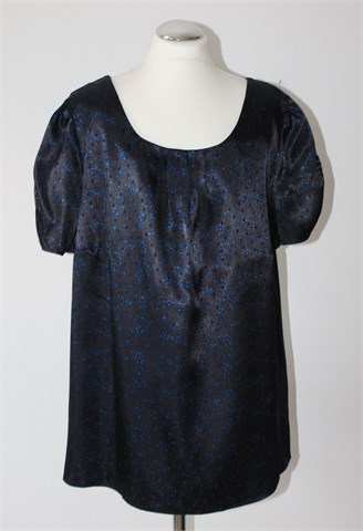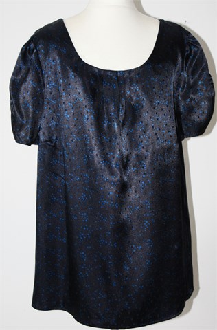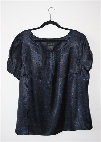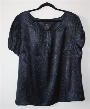 Lane Bryant bluza sa kratkim rukavima, tamno plave boje sa točkastim uzorkom (svijetlije plavim i crnim). Rukavi su prošiveni sa gumicom, sa prednje strane (ispod otvora dekoltea) faldice. Lagan i na dodir svilenkast materijal (blago sjajna). Nije rastezljiva.