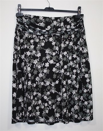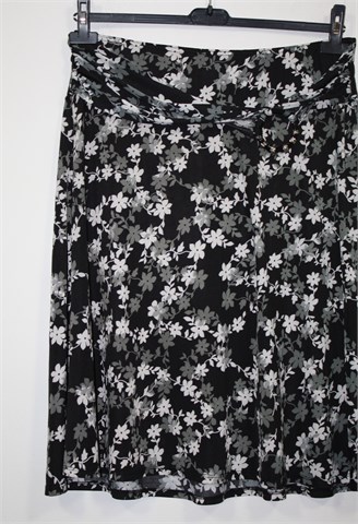 Lapis suknja crne boje sa cvjetnim printom u bijeloj i sivoj boji. Gumica u struku, sa prednje strane ukrasna traka (kao remen) sa ukrasnom kopčom. Materijal je tanak i lagan, vrlo rastezljiv.