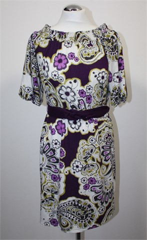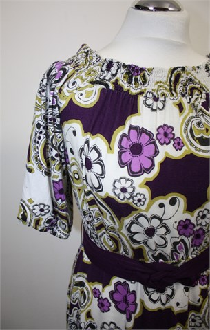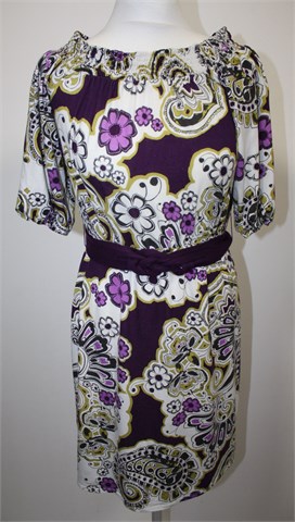 Laundry by Shelli Segal haljina sa poludugim rukavima, bijele boje sa šarenim printom. Prošivena gumicama oko dekoleta, gumice na krajevima rukava i u struku. U struku pripadajući remen ljubičaste boje (može se lako odšiti) sa kopčanjem na kukice u dva reda (jedna kukica je otpala a jednu bi trebalo malo pričvrstiti - ne smeta kod nošenja). Vrlo mekan i rastezljiv materijal.