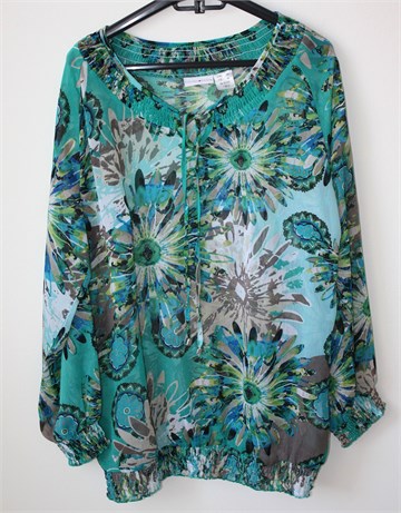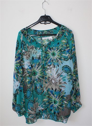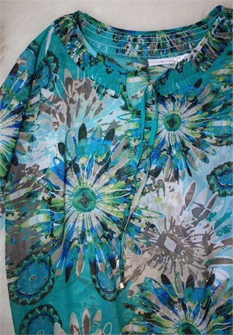 Laura Kent bluza/tunika sa dugim rukavima i šarenim printom (boje i uzorak printa vidljivi na slikama). Prošivena gumicama oko ovratnika, na rubovima rukava i na pasici. Trake za vezanje u ovratniku. Tanka i lagana, providna.