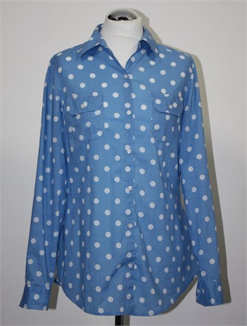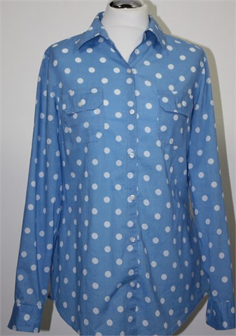 Laura T. Collection košulja sa dugim rukavima, plave boje sa bijelim točkastim printom. Prednje kopčanje, džepići na prsima (sa preklopom i gumbom). Prednji i stražnji ušitci, blago strukirana. Rukavi se mogu nositi i kao kraći (vanjski gumbić na rukavu i unutarnja vezica). Mekan, tanji i lagan pamuk.