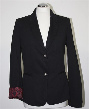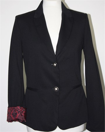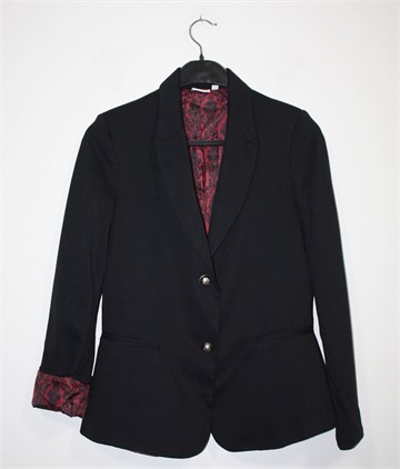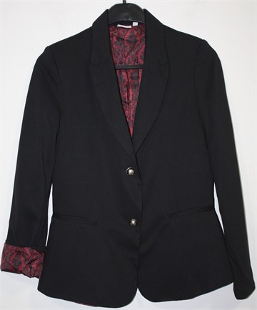 Laura T. sako/blazer crne boje sa lijepom bordo-crnom podstavom (rukavi se mogu nositi i podvinuti pa je podstava vidljiva). Prednje kopčanje s ukrasnim gumbima, bočni ukrasni džepovi. Blagi jastučići u ramenima, podstavljen.
