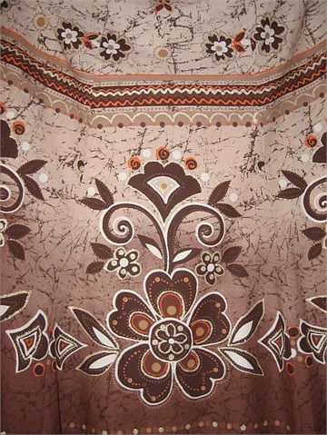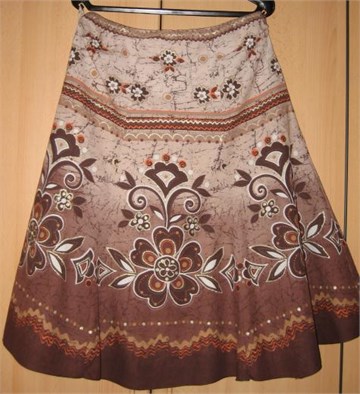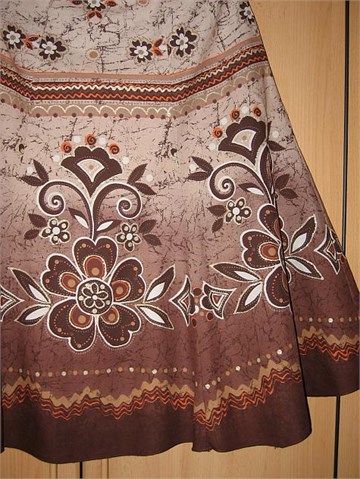 Pasica za remen. Podstavljena. Blago se širi prema dnu. Lepršava, ljetna. Bočni cif i gumbić. Malo šljokičav print.