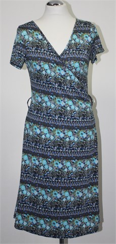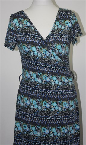 Lene-v haljina sa kratkim rukavima, cvjetnog retro uzorka u pretežno plavim nijansama. Preklop sa prednje strane (fiksan), u struku ušice za remen (bez remena). Vrlo mekan, svilenkast i rastezljiv materijal.