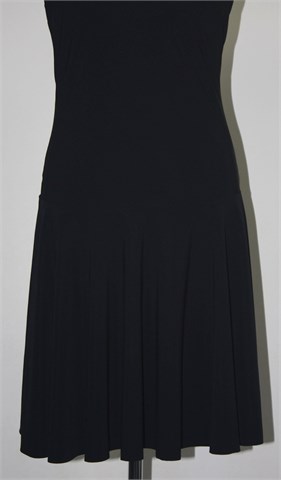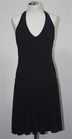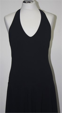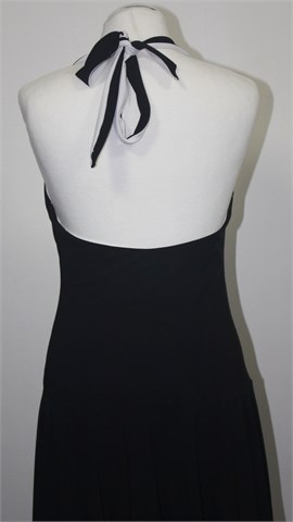 Leonarda L. haljina crne boje sa vezanjem oko vrata, leđa su otvorena. Gornji dio podstavljen jednakim materijalom ali bijele boje (na slici vidljivo na trakama za vezanje). Rezana u struku, prema dolje se blago širi. Mekan i rastezljiv materijal.