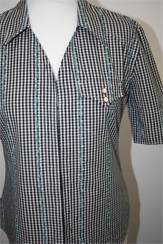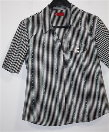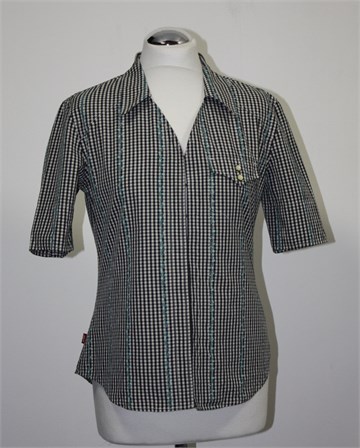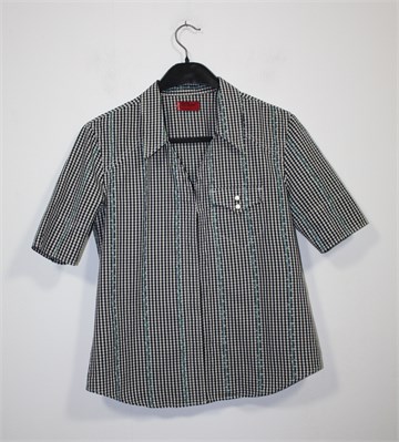 Levi's košulja sa kratkim rukavima, crno-bijele boje sa kockastim uzorkom i plavo-zelenim printom (vidljivo na slikama). Prednje kopčanje sa kopčicama (većim, ukupno ih je 7), na prsima džepić sa preklopom i gumbima (svi gumbi su ukrasni, sedefasti). Deblji i čvrst pamuk, izuzetno kvalitetan.