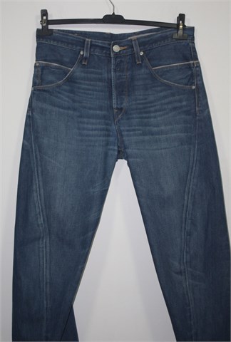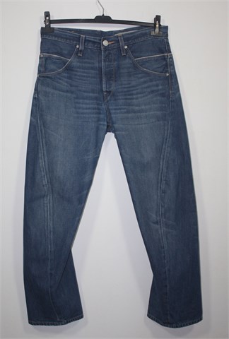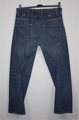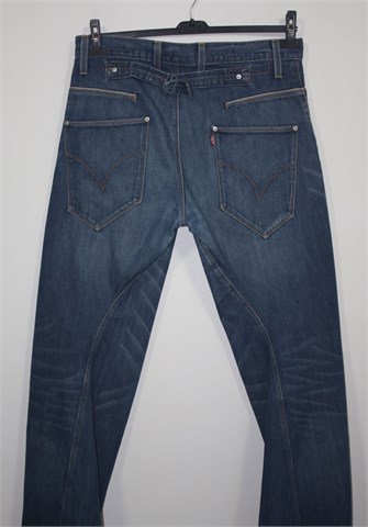 Levi's traper hlače srednje plave boje, mjestimično ispranog i iscufanog izgleda (tvornički used look). Prednje kopčanje, pasica za remen. Prednji i stražnji klasični džepovi. Koso rezane nogavice, mislim da je model twisted.