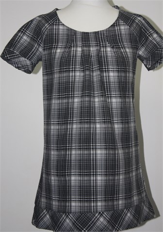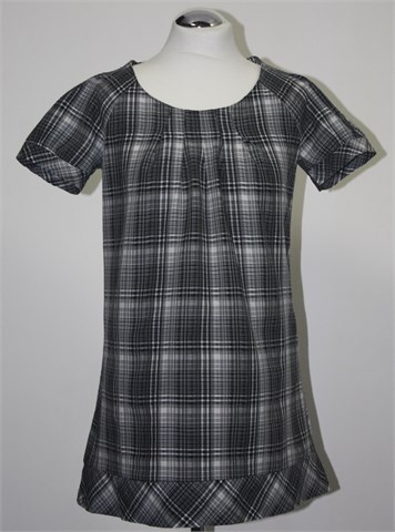 Life Time bluza/tunika sa kratkim rukavima, kombinacija crno-bijele boje s uzorkom (kao na slici). Prednje ukrasne faldice, šira u donjem dijelu. Tanji materijal, nije rastezljiv.