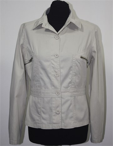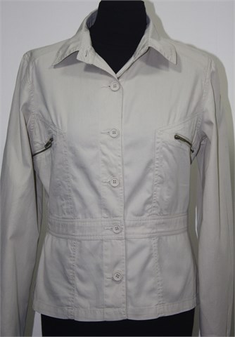 Lili Chic tanja pamučna jakna svijetlo bež boje. Prednje kopčanje na gumbe, džepići sa cifom na prsima. Detalji od konca na ramenima, vizualno rezana u struku.