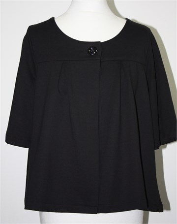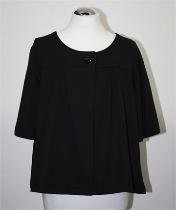 Lindex pamučni kardigan/blazer crne boje, sa poludugim rukavima. Sa prednje strane kopčanje na jedan gumb, širi model. Mekan i rastezljiv materijal (kao za tanje trenirke).