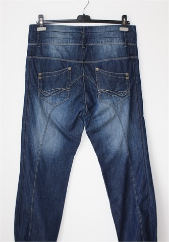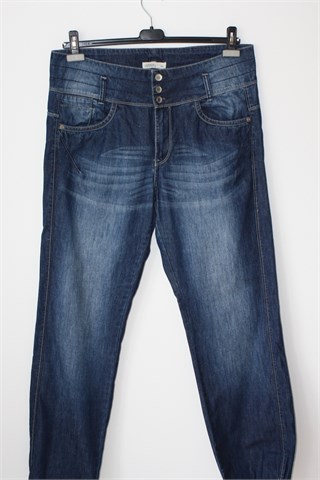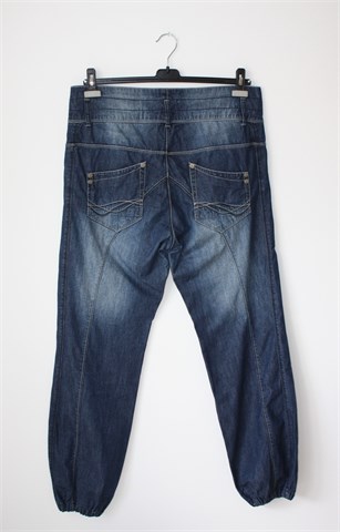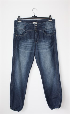 Generous Denim by Lindex traper hlače plave boje, mjestimično ispranog izgleda (tvornički used look). Prednji cif i kopčanje, pasica za remen. Prednji i stražnji džepovi. Stegnute gumicom na dnu nogavica. Tanji traper, nije rastezljiv.