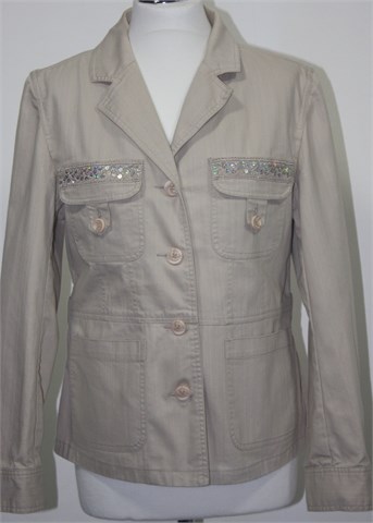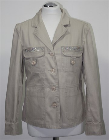 Lindon jakna svijetlo bež boje sa ukrasnim šljokicama na džepovima. Prednje kopčanje, bočni i džepovi na prsima. Vrlo blago rastezljiva.