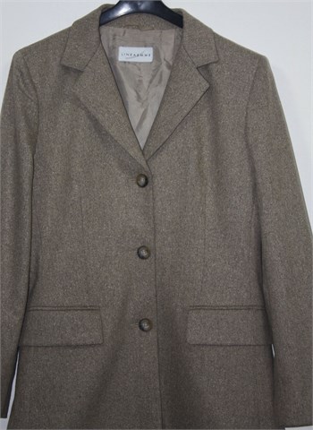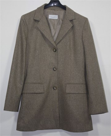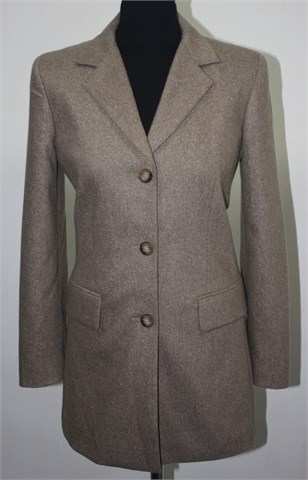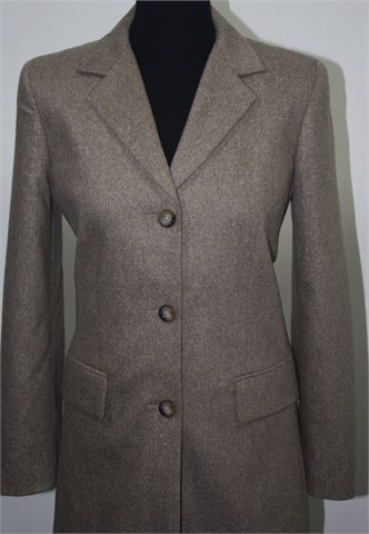 Lineaeme duži sako/kaput od štofa, prošarano smeđe-bež boje (diskretni špricani uzorak na materijalu). Prednje kopčanje, bočni džepovi sa preklopom (zašiveni). Lagani jastučići u ramenima, podstavljen.
