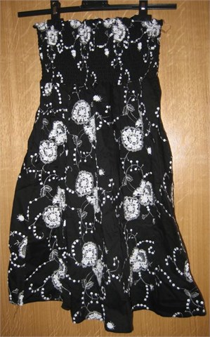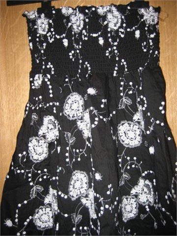 Preslatka tunika/kratka haljina crne boje sa končanim aplikacijama i našivenim šljokicama bijele boje. Gornji dio rastezljiv (ušivene "žabice") pa je prilično rastezljiv, donji dio se prema dolje širi. Vrlo lagan materijal, idealna za ljeto. Može se nositi kao tunika ili za one hrabrije kao haljinica :)