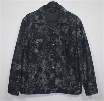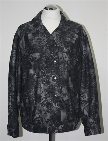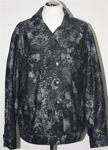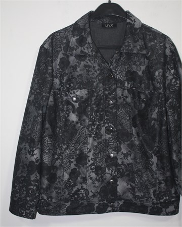 Liva jakna sive boje sa printom u crnoj boji. Krojena kao traper jakna, samo što je materijal puno tanji i lakši od klasičnog trapera. Jakna ima prednje kopčanje na gumbe i bočne džepove sa gumbom. Materijal je blago rastezljiv.