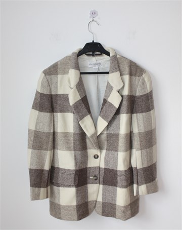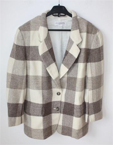 Liz Claiborne kaput u kombinaciji prljavo bijele i smeđe boje (uzorak vidljiv na slikama). Prednje kopčanje sa dva gumba, bočni džepovi sa preklopom. Blagi jastučići u ramenima, podstavljen. Većinski sastav je vuna.
