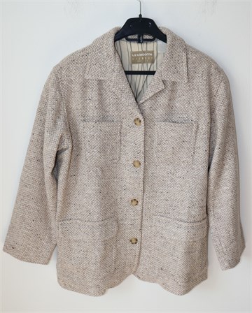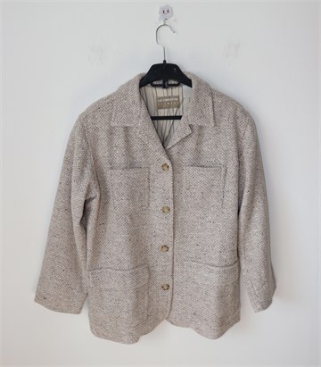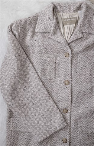 Liz Claiborne kaput srednje dužine, prošarano sivo-bež-bijele boje (diskretni špricani uzorak na materijalu - odlična kombinacija neutralnih boja). Prednje kopčanje, bočni džepovi sa preklopom i džepovi na prsima. Topli vuneni materijal, podstavljen. Jastučići u ramenima.