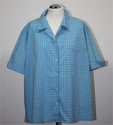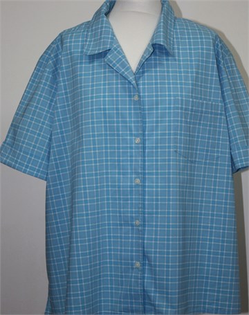 Liz Claiborne košulja sa kratkim rukavima, plave boje sa prugastim uzorkom. Prednje kopčanje, mali džepić na prsima. Stražnji ušitci, mali bočni prorezi. Rastezljiva.