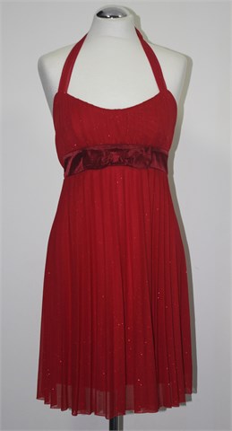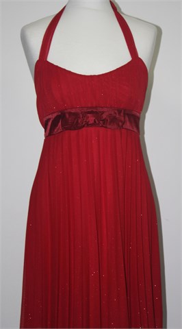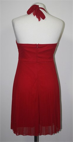 Love haljina crvene boje (boja je nešto zagasitija nego na slici) sa sitnim crvenim šljokicama na materijalu. Vezanje oko vrata, leđa su otvorena. Dio iznad grudiju je spužvasto podstavljen, ispod satenska trakica sa mašnicom. Na leđima je cif a uz gornji šav na leđima je provedena gumica pa je širina prilagodljiva. Vrlo lagana i prozračna, podstavljena.