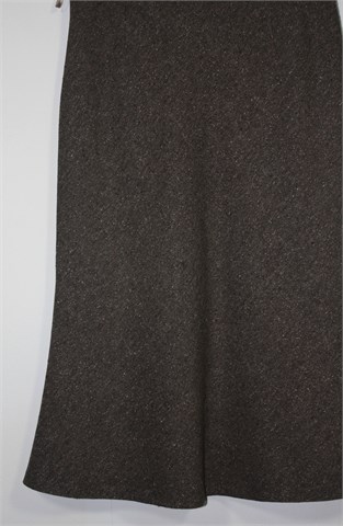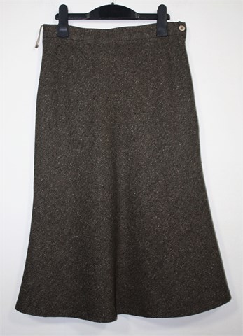 Luisa Lon suknja prošarano smeđe boje (špricani uzorak), midi dužine. Bočni cif i gumbić. Štofasti materijal, podstavljena. Blago rastezljiva.