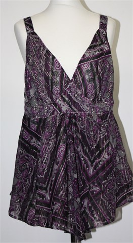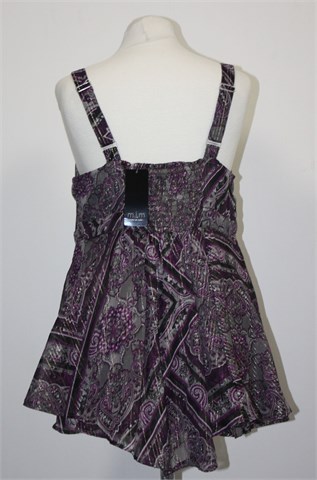M.I.M. topić/bluza (materijal je kao za tanje košulje), sa šarenim printom (boje i uzorci kao na slici) i sjajnim zlaćanim prugama (blago šljokave). Tanke podesive naramenice, lagano podstavljena u gornjem dijelu sa prednje strane. Donji dio u dva sloja, sa stražnje strane ušivene su gumice pa je širina prilagodljiva (vidjeti mjere). Lagana i lepršava.
