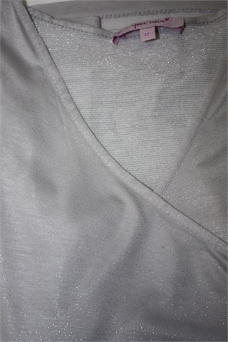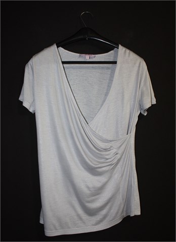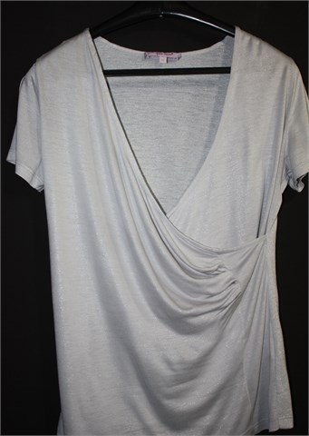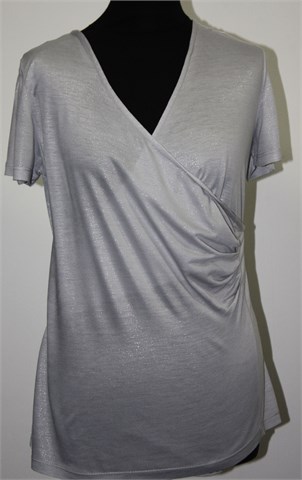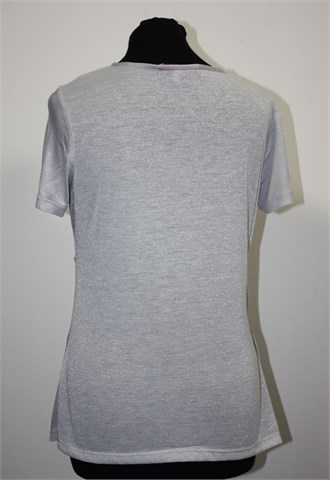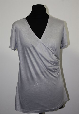 Per Una (Marks & Spencer) majica sa kratkim rukavima, sive boje. Sa prednje strane fiksni preklop, materijal ima točkasti srebrni uzorak. Sa stražnje strane je drugačiji materijal, sive boje sa šljokavim srebrnim prugama - providan. Blago rastezljiva.