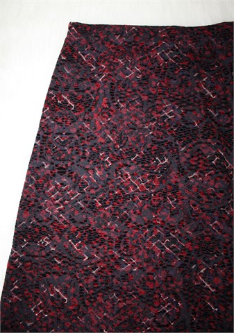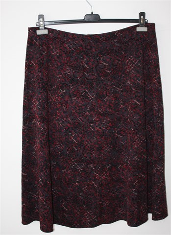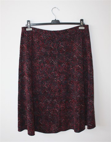 Marks & Spencer Classic suknja crveno-crne boje sa prošaranim uzorkom (vidljivo na slikama, oznaka boje na etiketi je purple mix), materijal je mjestimično blago reljafan i plišast. Gumica u struku (prilagodljiva širina), cijela blago rastezljiva.