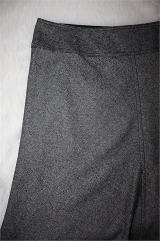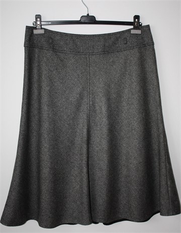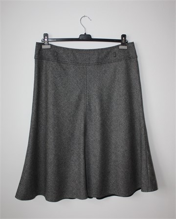 Marks & Spencer suknja prošarano crno-bijele boje (prugasti uzorak na materijalu - oznaka boje na etiketi je black mix). Stražnji cif i gumbić (gumbić se odšio ali može se zašiti bilo kakav jer je unutar suknja), vrlo uska pasica za remen. Podstavljena, rastezljiva (struk nije). Mekani vuneni štof.