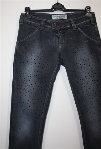 MET traper hlače tamnije sive boje, mjestimično ispranog i ocufanog izgleda (used look). Prednji cif i kopčanje, pasica za remen. Prednji i stražnji klasični džepovi. Aplikacije na nogavicama (vidljivo na slici), vrlo blago rastezljive.