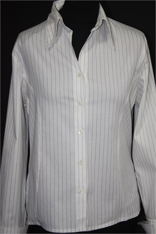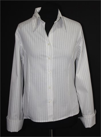 Madonna košulja sa dugim rukavima, bijele boje sa crnim prugama. Prednje kopčanje, prednji i stražnji ušitci (strukirana). Blago rastezljiva.