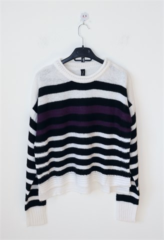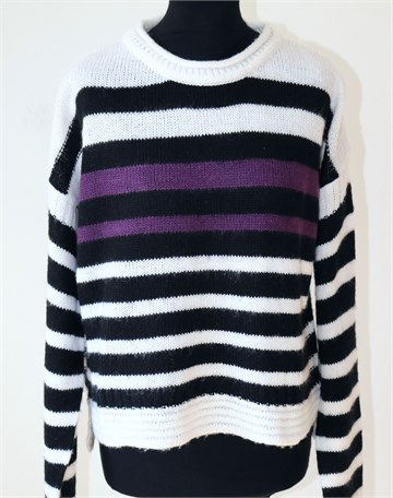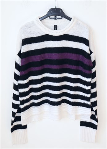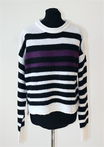 Madonna prugasta vesta u kombinaciji bijele, ljubičaste i crne boje. Mekano, mucasto i rastezljivo pletivo. Malo duža sa stražnje strane (vidjeti mjere), mali bočni prorezi.