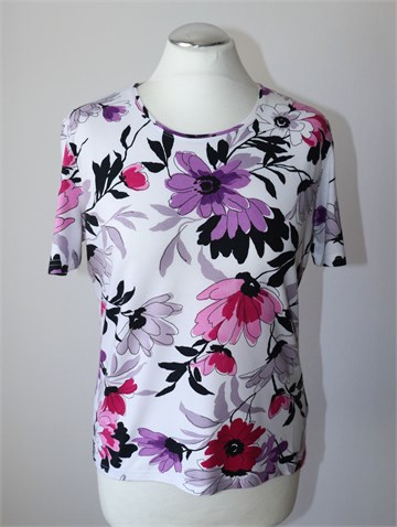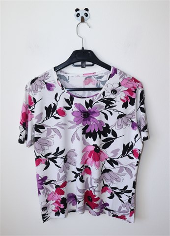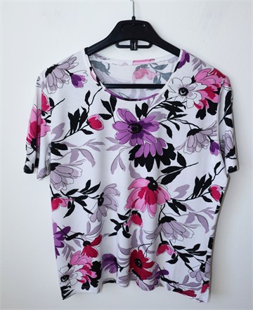 Majica sa kratkim rukavima, bijele boje sa šarenim cvjetnim printom (boje i print kao na slikama). Mekana i rastezljiva.